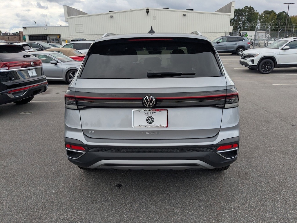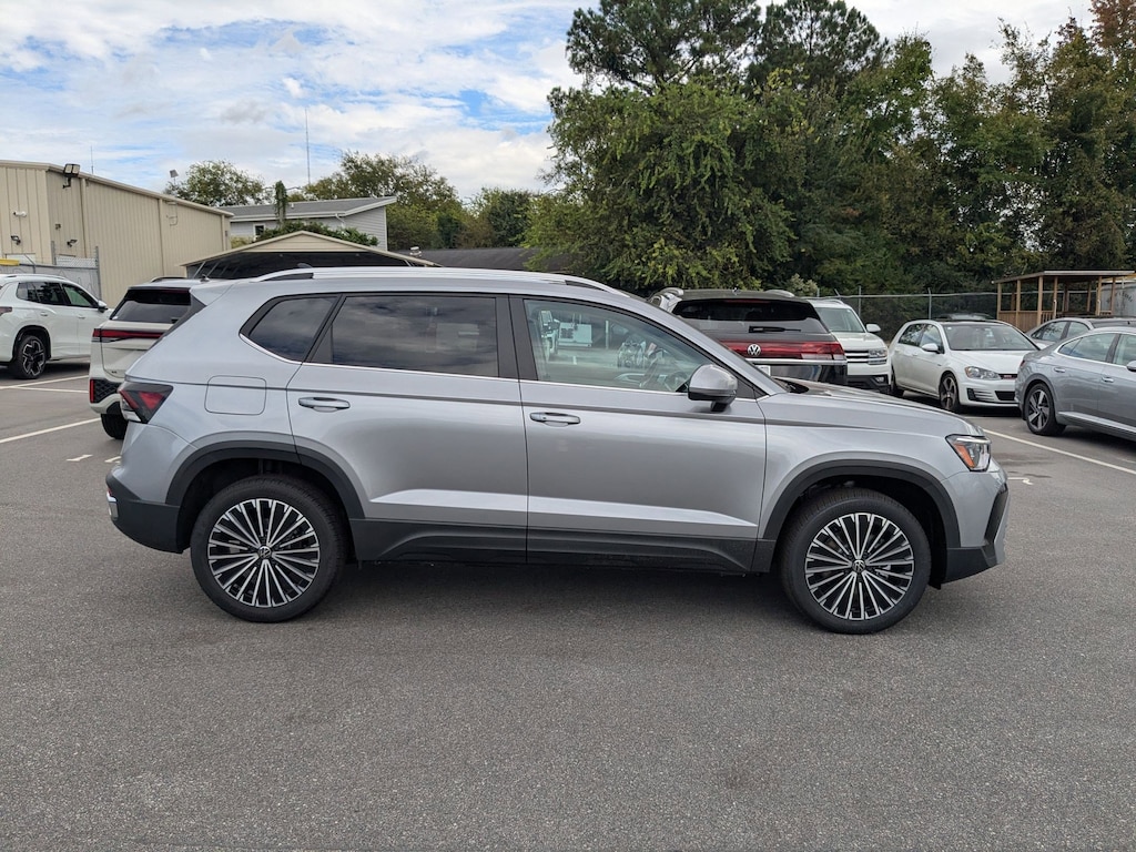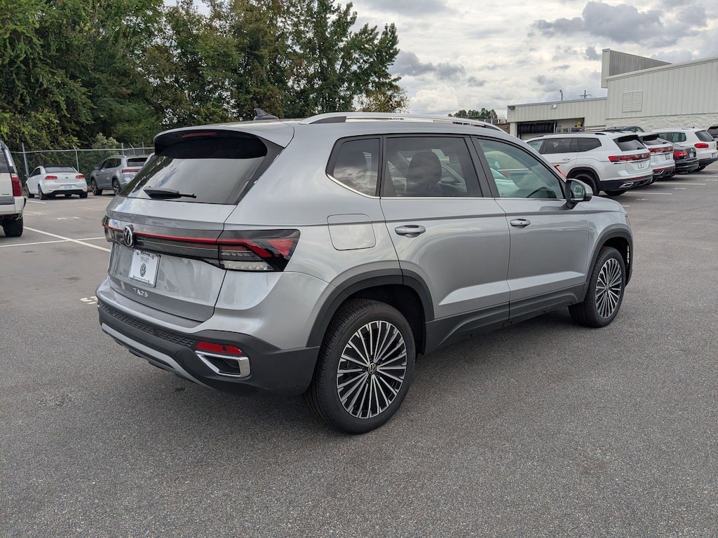 Silver 2025 Volkswagen Taos 1.5T SE FWD 8-Speed Automatic with Tiptronic 1.5L I4 Turbocharged DOHC 16V LEV3-SULEV30 174hp 4-Wheel Disc Brakes, 6 Speakers, ABS brakes, Active Blind Spot Monitor, Air Conditioning, Alloy wheels, AM/FM radio: SiriusXM with 360L, Auto High-beam Headlights, Automatic temperature control, Brake assist, Bumpers: body-color, CloudTex & Cloth Seating Surfaces, Compass, Delay-off headlights, Driver door bin, Driver vanity mirror, Dual front impact airbags, Dual front side impact airbags, Electronic Stability Control, Emergency communication system: VW Car-Net Safe & Secure 5-year, Exterior Parking Camera Rear, Front anti-roll bar, Front Bucket Seats, Front Center Armrest, Front dual zone A/C, Front reading lights, Front Strut Rear Torsion Beam Suspension, Front wheel independent suspension, Fully automatic headlights, Heated door mirrors, Heated Front Bucket Seats, Heated front seats, Heated steering wheel, Illuminated entry, Leather Shift Knob, Low tire pressure warning, Occupant sensing airbag, Outside temperature display, Overhead airbag, Overhead console, Panic alarm, Passenger door bin, Passenger vanity mirror, Power door mirrors, Power driver seat, Power steering, Power windows, Radio data system, Radio: MIB3 Composition Media AM/FM/HD, Rain sensing wipers, Rear anti-roll bar, Rear seat center armrest, Rear window defroster, Rear window wiper, Remote keyless entry, Security system, Speed control, Speed-sensing steering, Split folding rear seat, Spoiler, Steering wheel mounted audio controls, Tachometer, Telescoping steering wheel, Tilt steering wheel, Traction control, Trip computer, Variably intermittent wipers, Wheels: 18" 2-Tone Machined Alloy.