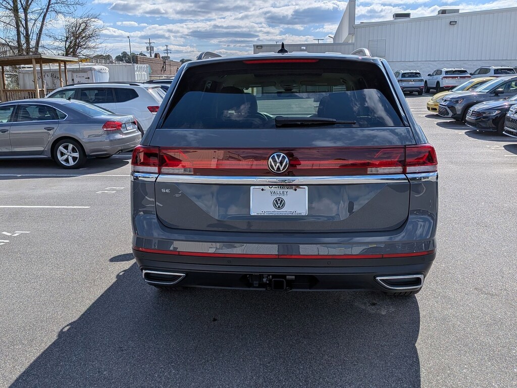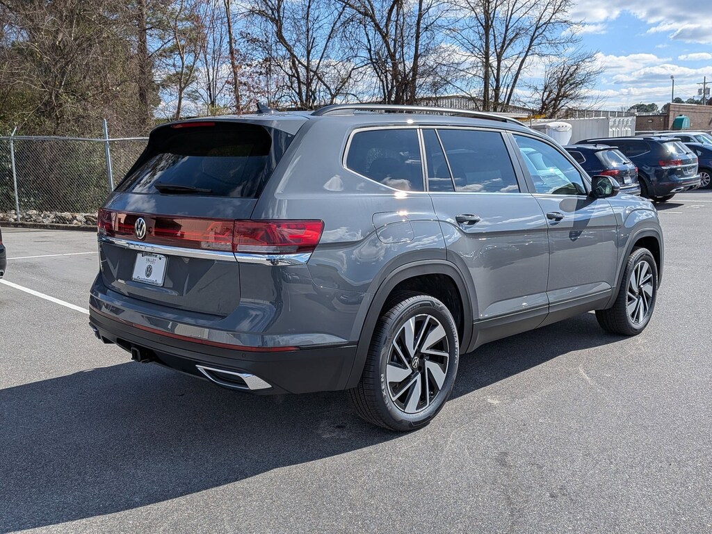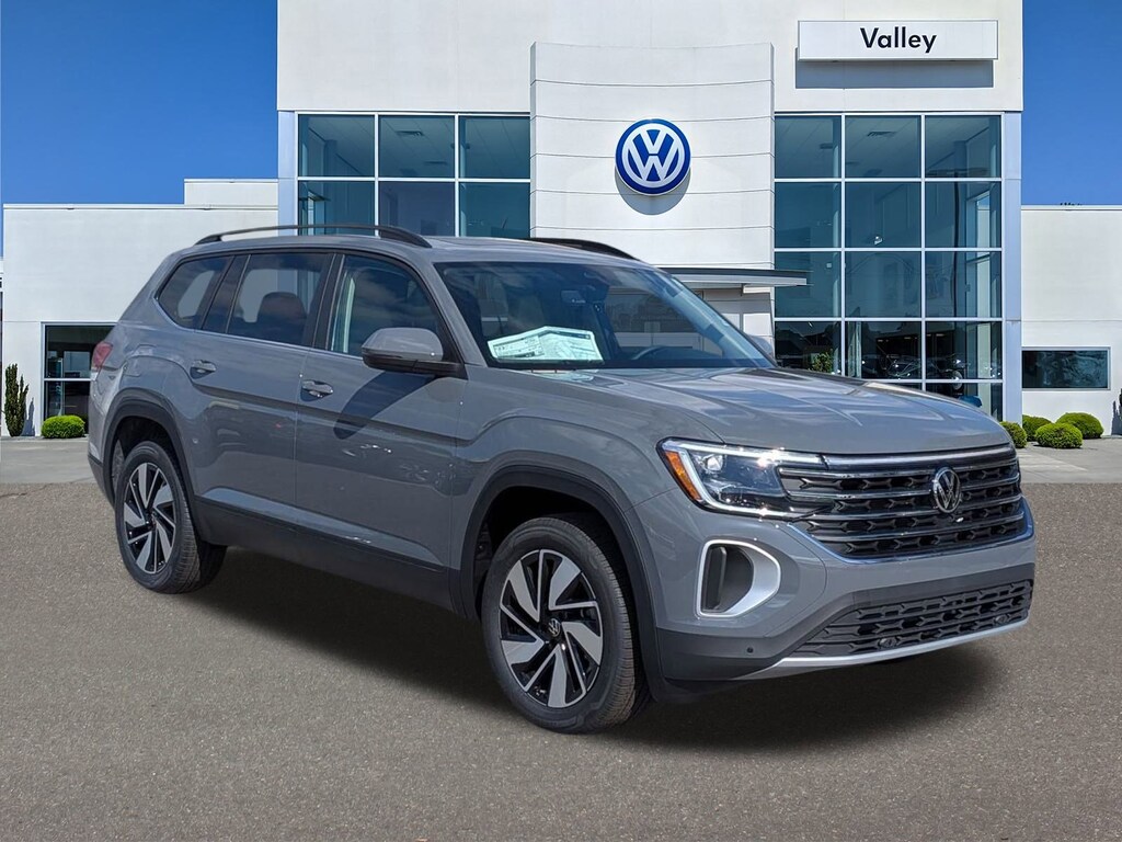 Gray 2026 Volkswagen Atlas 2.0T SE w/Technology FWD 8-Speed Automatic with Tiptronic 2.0L TSI 3rd row seats: split-bench, 4-Wheel Disc Brakes, 4-Wheel Independent Suspension, 6 Speakers, ABS brakes, Air Conditioning, Alloy wheels, AM/FM radio: SiriusXM with 360L, Auto High-beam Headlights, Auto-dimming Rear-View mirror, Automatic temperature control, Brake assist, Bumpers: body-color, Compass, Delay-off headlights, Driver door bin, Driver vanity mirror, Dual front impact airbags, Dual front side impact airbags, Electronic Stability Control, Emergency communication system: VW Car-Net Safe & Secure 5-year, Exterior Parking Camera Rear, Four wheel independent suspension, Front anti-roll bar, Front Bucket Seats, Front Center Armrest, Front dual zone A/C, Front fog lights, Front reading lights, Fully automatic headlights, Garage door transmitter: HomeLink, Heated and Actively Ventilated Front Bucket Seats, Heated door mirrors, Heated front seats, Heated steering wheel, Illuminated entry, Low tire pressure warning, Occupant sensing airbag, Outside temperature display, Overhead airbag, Overhead console, Panic alarm, Passenger door bin, Passenger vanity mirror, Perforated V-Tex Leatherette Seating Surfaces, Power door mirrors, Power driver seat, Power Liftgate, Power steering, Power windows, Radio data system, Radio: MIB3 Composition Media, Rain sensing wipers, Rear air conditioning, Rear anti-roll bar, Rear reading lights, Rear seat center armrest, Rear window defroster, Rear window wiper, Remote keyless entry, Security system, Speed control, Speed-sensing steering, Split folding rear seat, Spoiler, Steering wheel mounted audio controls, Tachometer, Telescoping steering wheel, Tilt steering wheel, Traction control, Trip computer, Turn signal indicator mirrors, Variably intermittent wipers, Ventilated front seats, Wheels: 20" 2-Tone Machined Alloy.