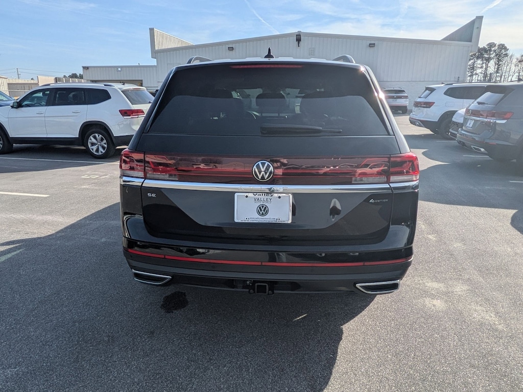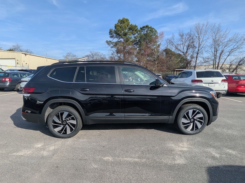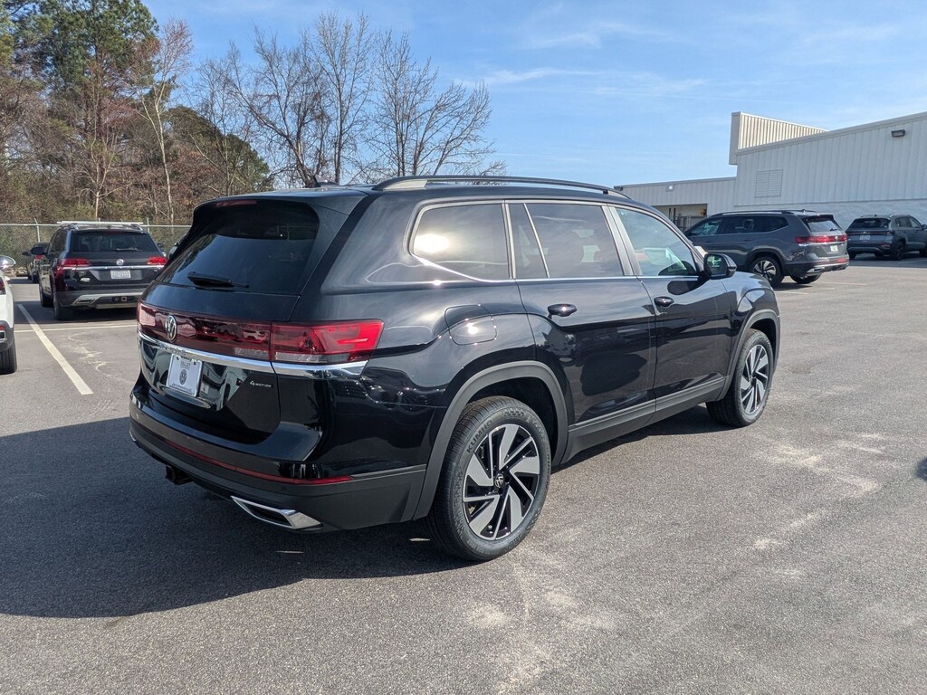 Deep Black 2026 Volkswagen Atlas 2.0T SE w/Technology AWD 8-Speed Automatic with Tiptronic 2.0L TSI 3rd row seats: split-bench, 4-Wheel Disc Brakes, 4-Wheel Independent Suspension, 6 Speakers, ABS brakes, Air Conditioning, Alloy wheels, AM/FM radio: SiriusXM with 360L, Auto High-beam Headlights, Auto-dimming Rear-View mirror, Automatic temperature control, Brake assist, Bumpers: body-color, Compass, Delay-off headlights, Driver door bin, Driver vanity mirror, Dual front impact airbags, Dual front side impact airbags, Electronic Stability Control, Emergency communication system: VW Car-Net Safe & Secure 5-year, Exterior Parking Camera Rear, Four wheel independent suspension, Front anti-roll bar, Front Bucket Seats, Front Center Armrest, Front dual zone A/C, Front fog lights, Front reading lights, Fully automatic headlights, Garage door transmitter: HomeLink, Heated and Actively Ventilated Front Bucket Seats, Heated door mirrors, Heated front seats, Heated steering wheel, Illuminated entry, Low tire pressure warning, Occupant sensing airbag, Outside temperature display, Overhead airbag, Overhead console, Panic alarm, Passenger door bin, Passenger vanity mirror, Perforated V-Tex Leatherette Seating Surfaces, Power door mirrors, Power driver seat, Power Liftgate, Power steering, Power windows, Radio data system, Radio: MIB3 Composition Media, Rain sensing wipers, Rear air conditioning, Rear anti-roll bar, Rear reading lights, Rear seat center armrest, Rear window defroster, Rear window wiper, Remote keyless entry, Security system, Speed control, Speed-sensing steering, Split folding rear seat, Spoiler, Steering wheel mounted audio controls, Tachometer, Telescoping steering wheel, Tilt steering wheel, Traction control, Trip computer, Turn signal indicator mirrors, Variably intermittent wipers, Ventilated front seats, Wheels: 20" 2-Tone Machined Alloy.