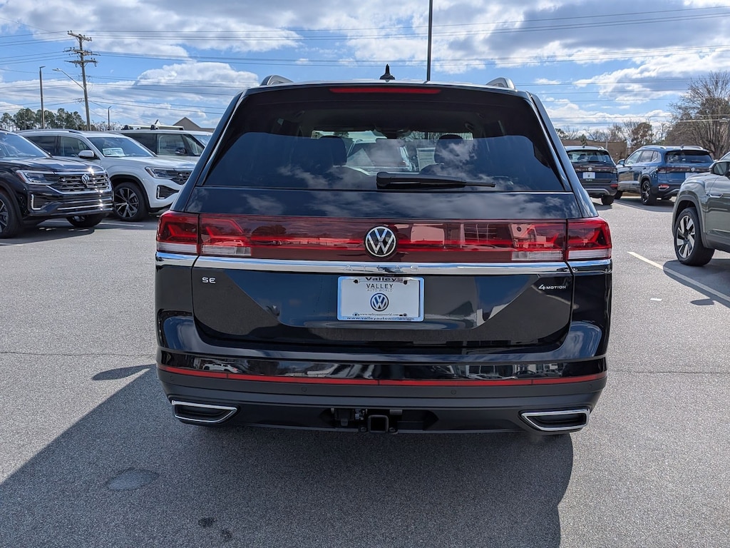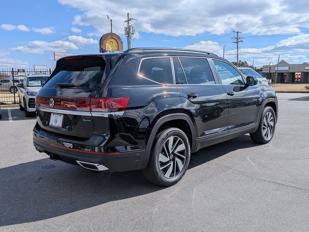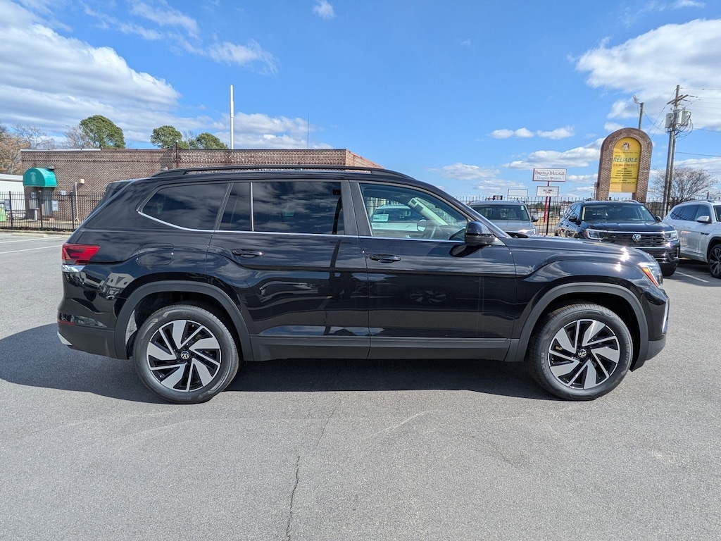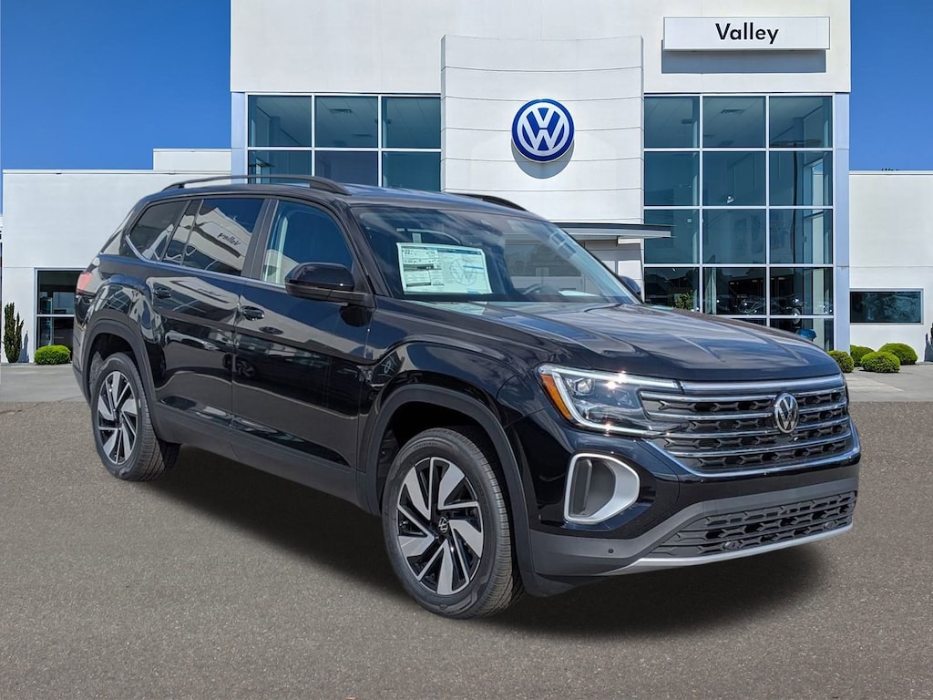 Deep Black 2026 Volkswagen Atlas 2.0T SE w/Technology AWD 8-Speed Automatic with Tiptronic 2.0L TSI 3rd row seats: split-bench, 4-Wheel Disc Brakes, 4-Wheel Independent Suspension, 6 Speakers, ABS brakes, Air Conditioning, Alloy wheels, AM/FM radio: SiriusXM with 360L, Auto High-beam Headlights, Auto-dimming Rear-View mirror, Automatic temperature control, Brake assist, Bumpers: body-color, Compass, Delay-off headlights, Driver door bin, Driver vanity mirror, Dual front impact airbags, Dual front side impact airbags, Electronic Stability Control, Emergency communication system: VW Car-Net Safe & Secure 5-year, Exterior Parking Camera Rear, Four wheel independent suspension, Front anti-roll bar, Front Bucket Seats, Front Center Armrest, Front dual zone A/C, Front fog lights, Front reading lights, Fully automatic headlights, Garage door transmitter: HomeLink, Heated and Actively Ventilated Front Bucket Seats, Heated door mirrors, Heated front seats, Heated steering wheel, Illuminated entry, Low tire pressure warning, Occupant sensing airbag, Outside temperature display, Overhead airbag, Overhead console, Panic alarm, Passenger door bin, Passenger vanity mirror, Perforated V-Tex Leatherette Seating Surfaces, Power door mirrors, Power driver seat, Power Liftgate, Power steering, Power windows, Radio data system, Radio: MIB3 Composition Media, Rain sensing wipers, Rear air conditioning, Rear anti-roll bar, Rear reading lights, Rear seat center armrest, Rear window defroster, Rear window wiper, Remote keyless entry, Security system, Speed control, Speed-sensing steering, Split folding rear seat, Spoiler, Steering wheel mounted audio controls, Tachometer, Telescoping steering wheel, Tilt steering wheel, Traction control, Trip computer, Turn signal indicator mirrors, Variably intermittent wipers, Ventilated front seats, Wheels: 20" 2-Tone Machined Alloy.