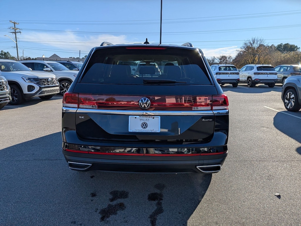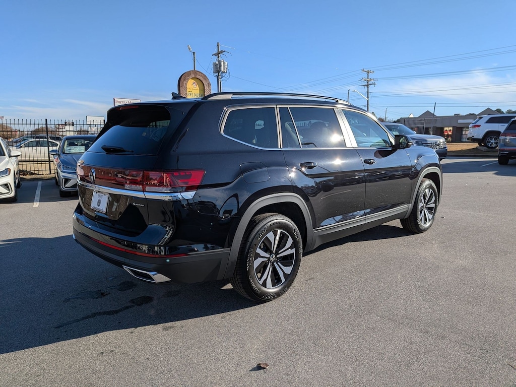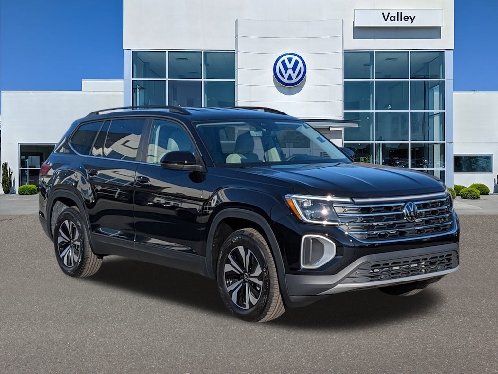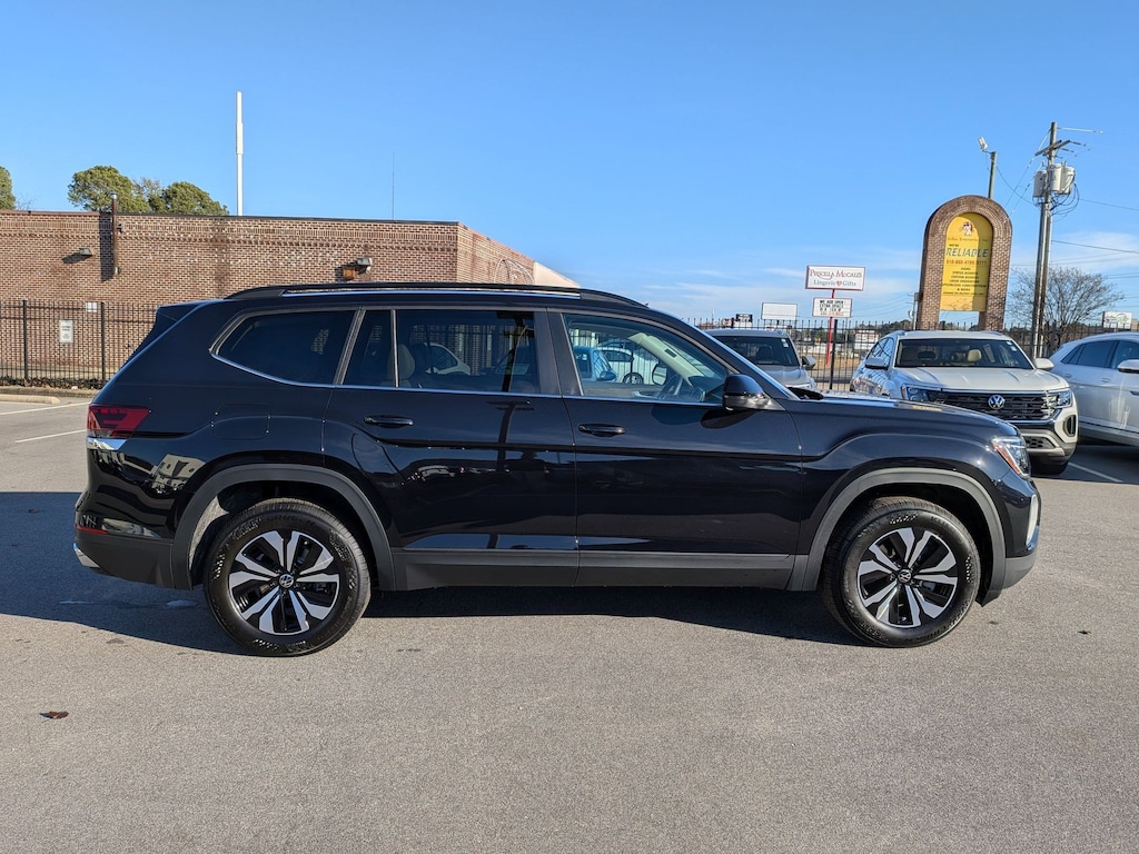 Deep Black 2026 Volkswagen Atlas 2.0T SE AWD 8-Speed Automatic with Tiptronic 2.0L TSI 3rd row seats: split-bench, 4-Wheel Disc Brakes, 4-Wheel Independent Suspension, 6 Speakers, ABS brakes, Air Conditioning, Alloy wheels, AM/FM radio: SiriusXM with 360L, Auto High-beam Headlights, Auto-dimming Rear-View mirror, Automatic temperature control, Brake assist, Bumpers: body-color, Delay-off headlights, Driver door bin, Driver vanity mirror, Dual front impact airbags, Dual front side impact airbags, Electronic Stability Control, Emergency communication system: VW Car-Net Safe & Secure 5-year, Exterior Parking Camera Rear, Four wheel independent suspension, Front anti-roll bar, Front Bucket Seats, Front Center Armrest, Front dual zone A/C, Front fog lights, Front reading lights, Fully automatic headlights, Heated & Actively Ventilated Front Bucket Seats, Heated door mirrors, Heated front seats, Heated steering wheel, Illuminated entry, Low tire pressure warning, Occupant sensing airbag, Outside temperature display, Overhead airbag, Overhead console, Panic alarm, Passenger door bin, Passenger vanity mirror, Perforated V-Tex Leatherette Seating Surfaces, Power door mirrors, Power driver seat, Power steering, Power windows, Radio data system, Radio: MIB3 Composition Media, Rain sensing wipers, Rear air conditioning, Rear anti-roll bar, Rear reading lights, Rear seat center armrest, Rear window defroster, Rear window wiper, Remote keyless entry, Security system, Speed control, Speed-sensing steering, Split folding rear seat, Spoiler, Steering wheel mounted audio controls, Tachometer, Telescoping steering wheel, Tilt steering wheel, Traction control, Trip computer, Turn signal indicator mirrors, Variably intermittent wipers, Ventilated front seats, Wheels: 18" 2-Tone Machined Alloy.