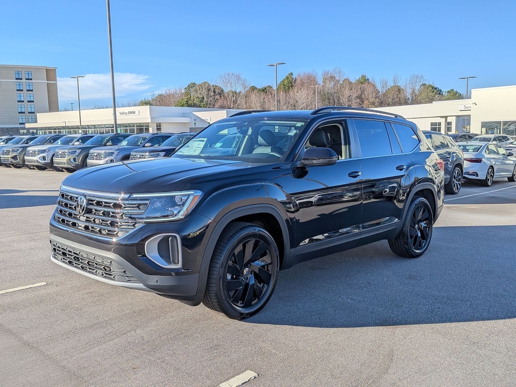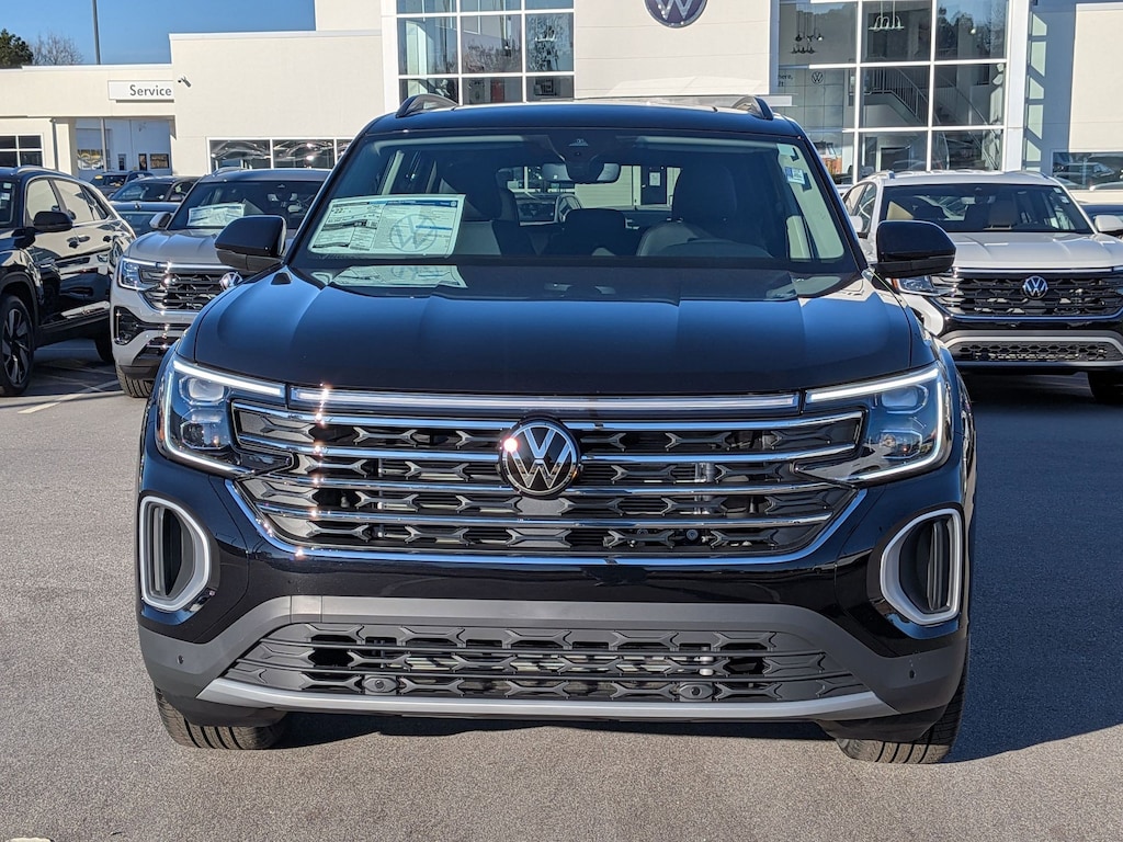 Deep Black 2026 Volkswagen Atlas 2.0T SE w/Technology AWD 8-Speed Automatic with Tiptronic 2.0L TSI 3rd row seats: split-bench, 4-Wheel Disc Brakes, 4-Wheel Independent Suspension, 6 Speakers, ABS brakes, Air Conditioning, Alloy wheels, AM/FM radio: SiriusXM with 360L, Auto High-beam Headlights, Auto-dimming Rear-View mirror, Automatic temperature control, Brake assist, Bumpers: body-color, Compass, Delay-off headlights, Driver door bin, Driver vanity mirror, Dual front impact airbags, Dual front side impact airbags, Electronic Stability Control, Emergency communication system: VW Car-Net Safe & Secure 5-year, Exterior Parking Camera Rear, Four wheel independent suspension, Front anti-roll bar, Front Bucket Seats, Front Center Armrest, Front dual zone A/C, Front fog lights, Front reading lights, Fully automatic headlights, Garage door transmitter: HomeLink, Heated & Actively Ventilated Front Bucket Seats, Heated door mirrors, Heated front seats, Heated steering wheel, Illuminated entry, Low tire pressure warning, Occupant sensing airbag, Outside temperature display, Overhead airbag, Overhead console, Panic alarm, Passenger door bin, Passenger vanity mirror, Perforated V-Tex Leatherette Seating Surfaces, Power door mirrors, Power driver seat, Power Liftgate, Power steering, Power windows, Radio data system, Radio: MIB3 Composition Media, Rain sensing wipers, Rear air conditioning, Rear anti-roll bar, Rear reading lights, Rear seat center armrest, Rear window defroster, Rear window wiper, Remote keyless entry, Security system, Speed control, Speed-sensing steering, Split folding rear seat, Spoiler, Steering wheel mounted audio controls, Tachometer, Telescoping steering wheel, Tilt steering wheel, Traction control, Trip computer, Turn signal indicator mirrors, Variably intermittent wipers, Ventilated front seats, Wheels: 20" 2-Tone Machined Alloy.