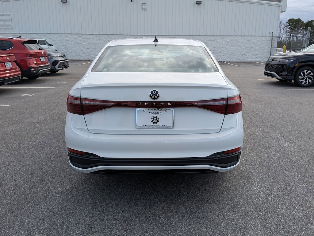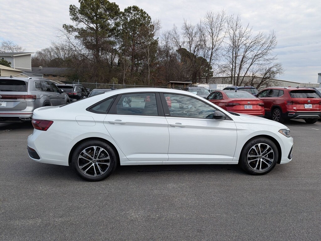 Pure White 2026 Volkswagen Jetta 1.5T Sport FWD 8-Speed Automatic with Tiptronic 1.5L I-4 DI DOHC Turbocharged Cloth, 4 Speakers, 4-Wheel Disc Brakes, ABS brakes, Active Blind Spot Monitor, Air Conditioning, Alloy wheels, Auto-dimming Rear-View mirror, Automatic temperature control, Brake assist, Bumpers: body-color, Cloth Seat Trim, Delay-off headlights, Driver door bin, Driver vanity mirror, Dual front impact airbags, Dual front side impact airbags, Electronic Stability Control, Emergency communication system: VW Car-Net Safe & Secure 5-year, Exterior Parking Camera Rear, Front anti-roll bar, Front Bucket Seats, Front Center Armrest, Front dual zone A/C, Front wheel independent suspension, Fully automatic headlights, Heated door mirrors, Heated Front Seats, Heated front seats, Illuminated entry, Leather Shift Knob, Leather steering wheel, Low tire pressure warning, Occupant sensing airbag, Outside temperature display, Overhead airbag, Overhead console, Panic alarm, Passenger door bin, Passenger vanity mirror, Power door mirrors, Power steering, Power windows, Radio data system, Radio: MIB3 Composition Color with 8" Touchscreen, Rain sensing wipers, Rear anti-roll bar, Rear reading lights, Rear seat center armrest, Rear window defroster, Remote keyless entry, Speed control, Speed-sensing steering, Split folding rear seat, Steering wheel mounted audio controls, Tachometer, Telescoping steering wheel, Tilt steering wheel, Traction control, Trip computer, Variably intermittent wipers, Wheels: 17" 2-Tone Machined Alloy, Cloth.