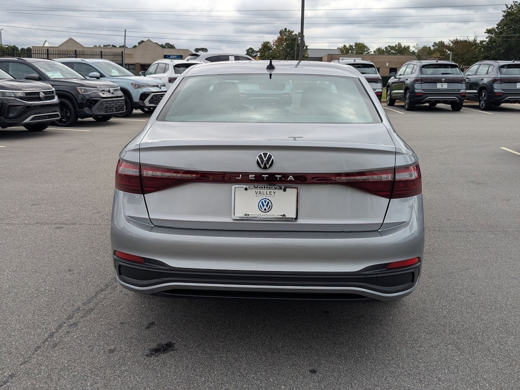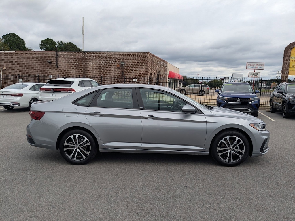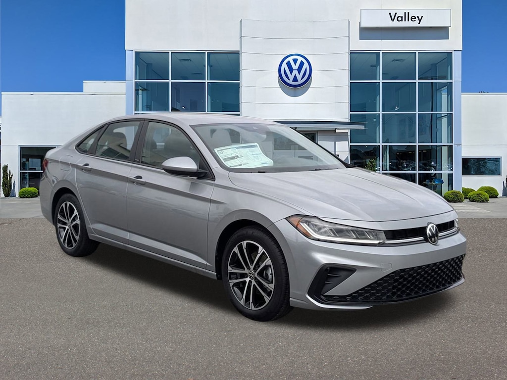 Silver 2026 Volkswagen Jetta 1.5T Sport FWD 8-Speed Automatic with Tiptronic 1.5L I-4 DI DOHC Turbocharged Cloth, 4 Speakers, 4-Wheel Disc Brakes, ABS brakes, Active Blind Spot Monitor, Air Conditioning, Alloy wheels, Auto-dimming Rear-View mirror, Automatic temperature control, Brake assist, Bumpers: body-color, Cloth Seat Trim, Delay-off headlights, Driver door bin, Driver vanity mirror, Dual front impact airbags, Dual front side impact airbags, Electronic Stability Control, Emergency communication system: VW Car-Net Safe & Secure 5-year, Exterior Parking Camera Rear, Front anti-roll bar, Front Bucket Seats, Front Center Armrest, Front dual zone A/C, Front wheel independent suspension, Fully automatic headlights, Heated door mirrors, Heated Front Seats, Heated front seats, Illuminated entry, Leather Shift Knob, Leather steering wheel, Low tire pressure warning, Occupant sensing airbag, Outside temperature display, Overhead airbag, Overhead console, Panic alarm, Passenger door bin, Passenger vanity mirror, Power door mirrors, Power steering, Power windows, Radio data system, Radio: MIB3 Composition Color w/8" Touchscreen, Rain sensing wipers, Rear anti-roll bar, Rear reading lights, Rear seat center armrest, Rear window defroster, Remote keyless entry, Speed control, Speed-sensing steering, Split folding rear seat, Steering wheel mounted audio controls, Tachometer, Telescoping steering wheel, Tilt steering wheel, Traction control, Trip computer, Variably intermittent wipers, Wheels: 17" 2-Tone Machined Alloy, Cloth.