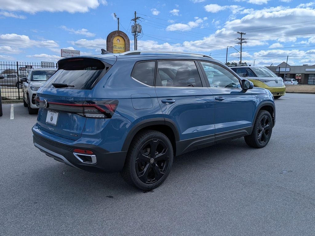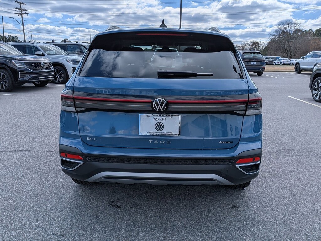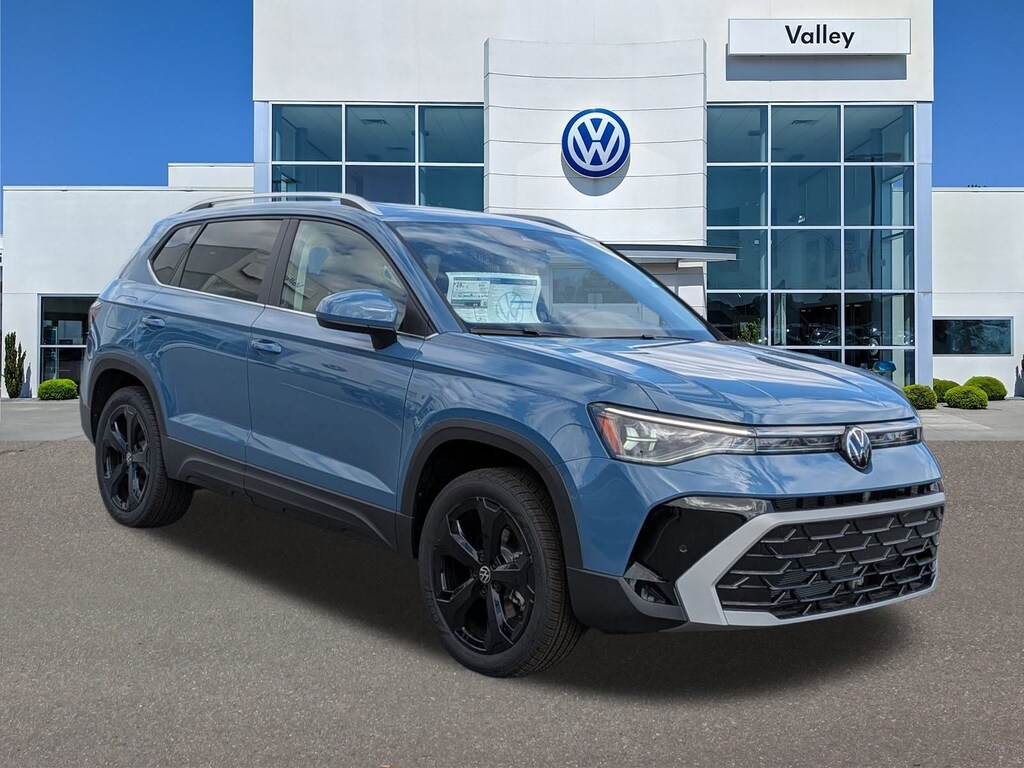Blue 2026 Volkswagen Taos 1.5T SEL AWD 8-Speed Automatic with Tiptronic 1.5L I4 Turbocharged DOHC 16V LEV3-SULEV30 174hp 4-Wheel Disc Brakes, 8 Speakers, ABS brakes, Active Blind Spot Monitor, Air Conditioning, Alloy wheels, AM/FM radio: SiriusXM with 360L, Auto High-beam Headlights, Auto-dimming Rear-View mirror, Automatic temperature control, Brake assist, Bumpers: body-color, Compass, Delay-off headlights, Driver door bin, Driver vanity mirror, Dual front impact airbags, Dual front side impact airbags, Electronic Stability Control, Emergency communication system: VW Car-Net Safe & Secure 5-year, Exterior Parking Camera Rear, Four wheel independent suspension, Front anti-roll bar, Front Bucket Seats, Front Center Armrest, Front dual zone A/C, Front reading lights, Front Strut Rear Multi-Link Suspension, Fully automatic headlights, Heated and Actively Ventilated Front Bucket Seats, Heated door mirrors, Heated front seats, Heated steering wheel, Illuminated entry, Leather Shift Knob, Low tire pressure warning, Navigation system: VW Car-Net Guide & Inform, Occupant sensing airbag, Outside temperature display, Overhead airbag, Overhead console, Panic alarm, Passenger door bin, Passenger vanity mirror, Perforated Vienna Leather Seating Surfaces, Power door mirrors, Power driver seat, Power moonroof, Power steering, Power windows, Radio data system, Radio: MIB3 Discover Media AM/FM/HD, Rain sensing wipers, Rear anti-roll bar, Rear seat center armrest, Rear window defroster, Rear window wiper, Remote keyless entry, Security system, Speed control, Speed-sensing steering, Split folding rear seat, Spoiler, Steering wheel mounted audio controls, Tachometer, Telescoping steering wheel, Tilt steering wheel, Traction control, Trip computer, Variably intermittent wipers, Ventilated front seats, Wheels: 19" 2-Tone Machined Alloy.