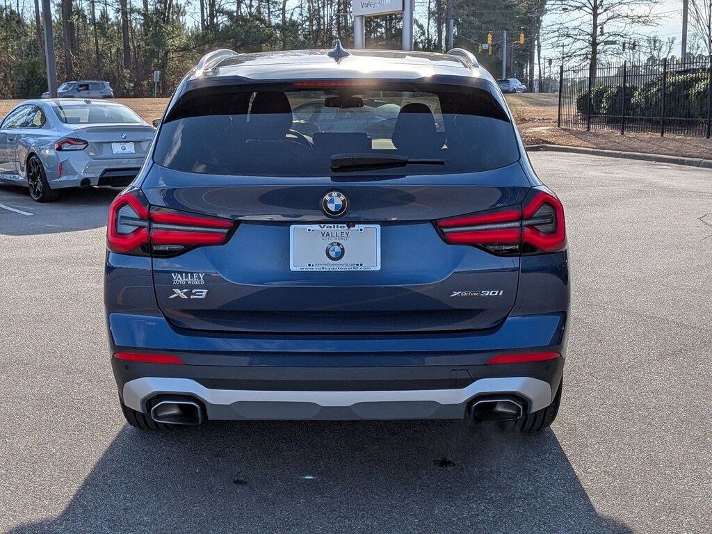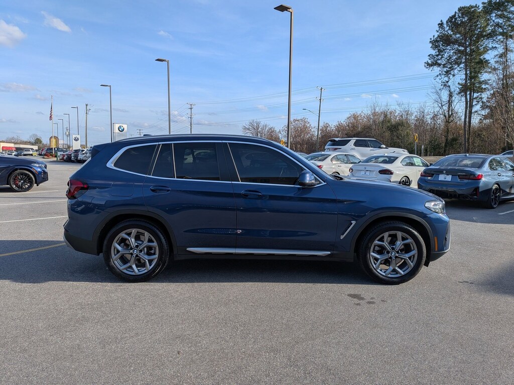Clean CARFAX. Phytonic Blue Metallic 2022 BMW X3 xDrive30i AWD 8-Speed Automatic Sport 2.0L I4 TwinPower Turbo 8-Speed Automatic Sport, 12 Speakers, 3.385 Axle Ratio, 4-Wheel Disc Brakes, ABS brakes, Air Conditioning, Alloy wheels, Aluminum Interior Trim, AM/FM Radio, AM/FM radio: SiriusXM with 360L, Apple CarPlay & Android Auto Compatibility, Auto High-beam Headlights, Auto-dimming door mirrors, Auto-dimming Rear-View mirror, Automatic temperature control, BMW Assist eCall, BMW TeleServices, Brake assist, Bumpers: body-color, Comfort Access Keyless Entry, Connected Package Pro, ConnectedDrive Services, Delay-off headlights, Driver door bin, Driver vanity mirror, Dual front impact airbags, Dual front side impact airbags, Electronic Stability Control, Emergency communication system: BMW Assist eCall, Enhanced Bluetooth, Exterior Parking Camera Rear, Four wheel independent suspension, Front anti-roll bar, Front Bucket Seats, Front Center Armrest, Front dual zone A/C, Front reading lights, Front Ventilated Seats, Fully automatic headlights, Garage door transmitter, Genuine wood dashboard insert, Genuine wood door panel insert, Gesture Control, Heated door mirrors, Heated Front Seats, Heated Steering Wheel, Hi-Fi Sound System, Illuminated entry, Knee airbag, Live Cockpit Pro w/Navigation, Low tire pressure warning, Lumbar Support, Memory seat, Navigation, Navigation System, Occupant sensing airbag, Outside temperature display, Overhead airbag, Panic alarm, Panoramic Moonroof, Passenger door bin, Passenger vanity mirror, Perforated SensaTec Upholstery, Power door mirrors, Power driver seat, Power Front Seats, Power Liftgate, Power passenger seat, Power steering, Power windows, Premium Package 2, Radio data system, Rain sensing wipers, Rear air conditioning, Rear anti-roll bar, Rear reading lights, Rear seat center armrest, Rear window defroster, Rear window wiper, Remote Engine Start, Remote keyless entry, Roof rack: rails only, Security system, SiriusXM w/360L, Speed control, Speed-sensing steering, Speed-Sensitive Wipers, Split folding rear seat, Spoiler, Sport Seats, Sport steering wheel, Steering wheel mounted audio controls, Tachometer, Telescoping steering wheel, Tilt steering wheel, Traction control, Trip computer, Turn signal indicator mirrors, Variably intermittent wipers, Wheels: 19" x 7.5" Y-Spoke (Style 693), WiFi Hotspot, 8-Speed Automatic Sport.
