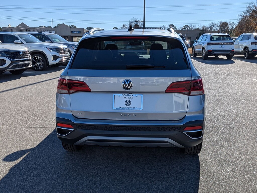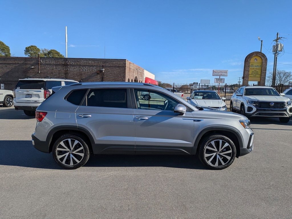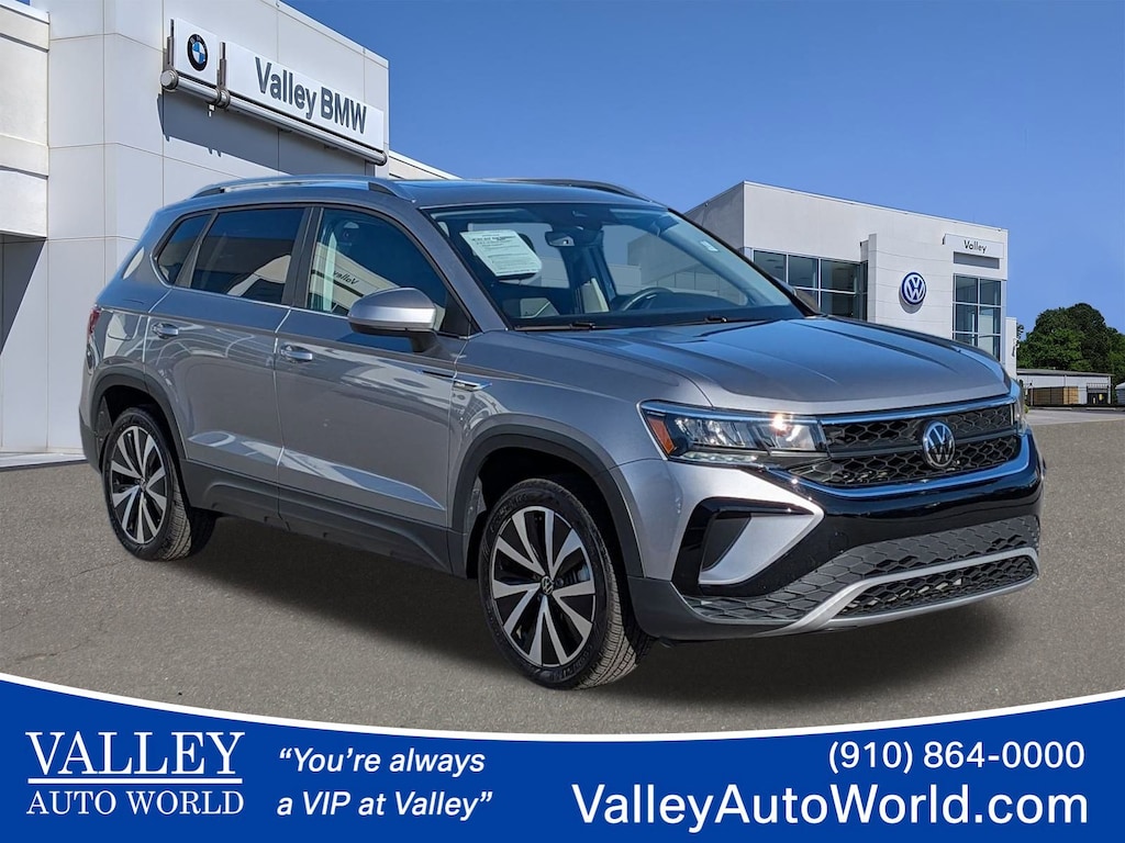 CARFAX One-Owner. Clean CARFAX. Pyrite Silver Metallic 2023 Volkswagen Taos 1.5T SE FWD 8-Speed Automatic with Tiptronic 1.5L I4 Turbocharged DOHC 16V LEV3-SULEV30 158hp 3.23 Axle Ratio, 4-Wheel Disc Brakes, 6 Speakers, ABS brakes, Active Blind Spot Monitor, Air Conditioning, Alloy wheels, AM/FM radio: SiriusXM with 360L, Auto High-beam Headlights, Brake assist, Bumpers: body-color, CloudTex & Cloth Seating Surfaces, Compass, Delay-off headlights, Driver door bin, Driver vanity mirror, Dual front impact airbags, Dual front side impact airbags, Electronic Stability Control, Emergency communication system: VW Car-Net Safe & Secure 5-year, Exterior Parking Camera Rear, Front anti-roll bar, Front Bucket Seats, Front Center Armrest, Front reading lights, Front Strut Rear Torsion Beam Suspension, Front wheel independent suspension, Fully automatic headlights, Heated door mirrors, Heated Front Comfort Seats, Heated front seats, Heated steering wheel, Illuminated entry, Leather Shift Knob, Low tire pressure warning, Occupant sensing airbag, Outside temperature display, Overhead airbag, Overhead console, Panic alarm, Passenger door bin, Passenger vanity mirror, Power door mirrors, Power driver seat, Power steering, Power windows, Radio data system, Radio: MIB3 Composition Media AM/FM/HD, Rain sensing wipers, Rear anti-roll bar, Rear seat center armrest, Rear window defroster, Rear window wiper, Remote keyless entry, Roof rack: rails only, Security system, Speed control, Speed-sensing steering, Split folding rear seat, Spoiler, Steering wheel mounted audio controls, Tachometer, Telescoping steering wheel, Tilt steering wheel, Traction control, Trip computer, Variably intermittent wipers, Wheels: 18" 2-Tone Machined Alloy.